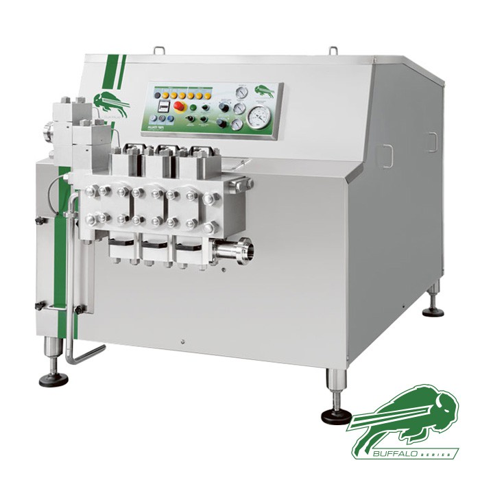 Корпус насоса изготовлен из толстостенного высокопрочного чугуна высшего сорта, спроектированного так, чтобы выдерживать большие нагрузки и устранять вибрации. Коленчатый вал изготовлен из специальной кованой стали, прошедшей термообработку. Он поддерживается прочными роликовыми подшипниками (бронзовые подшипники используются только на шатунных шейках). Силовая передача с двойным редуктором: клиновые ремни/шкивы. Смазочные установки различного типа (в зависимости от модели машины), во всех из них уровень масла определяется соответствующим датчиком (в более крупных моделях также имеется трубчатый теплообменник для охлаждения масла вместе с сигнализацией неравномерного давления и высокая температурой). Трехфазный, 4-х полюсной электродвигатель переменного тока. Каркас изготовлен из разборной сатиновой нержавеющей панели и стальных ножек. Комплектующие: вторая ступень гомогенизации, фиксированная или переменная производительность, амортизирующие пульсации, манометры, асептическая версия.